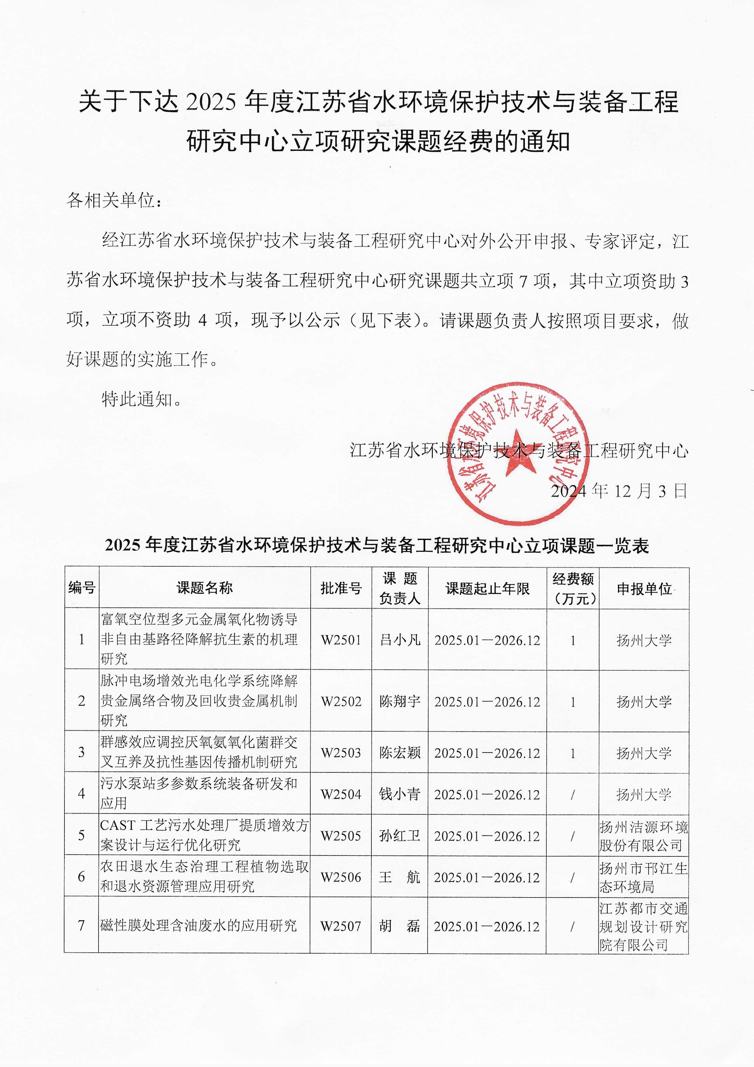 关于下达2025年度江苏省水环境保护技术与装备工程 研究中心立项研究课题经费的通知